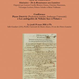 Conférences et rencontres mars 2026 Creativity in translation : Dialogue, embodiment, process 17 Mar 17 h 00 min - 19 h 00 min Salle GrandjaviMulhouse (68) Itinéraires – De la Renaissance aux Lumières 19 Mar 17 h 00 min - 19 h 00 min Salle GrandjaviMulhouse (68) Pas d'événement actuellement programmé.